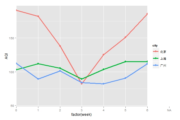 别的我们还可以按差异的礼拜数来归纳数据,以调查一周七天时间内,氛围质量是否有所变革。我们按差异的礼拜数计较了AQI中位数,从下图看到,这三个都市的模式有点临近,周三的氛围质量较好,而周末氛围质量较差。这一点北京表示的更为突出。所以说周末照旧宅在家里吧。