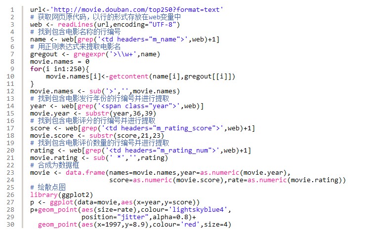 下面我们用一个较大的例子来说明在实际的数据抓取事情中,如何利用正则表达式。豆瓣影戏是博主常常去的处所。此次任务方针是要抓取豆瓣影戏中250部较佳影戏的资料。R代码如下: