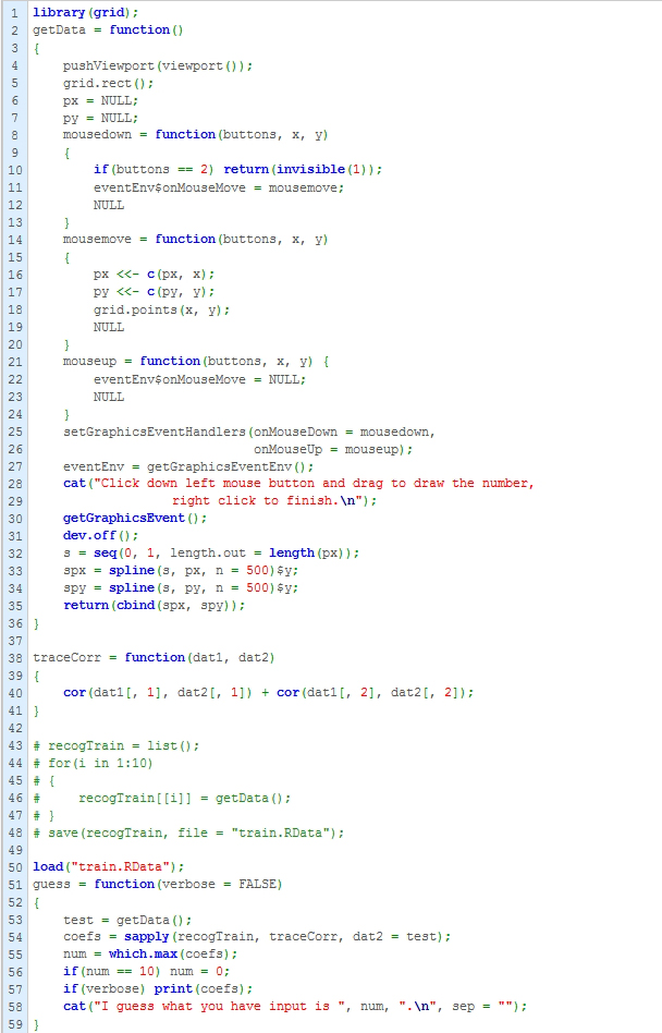 当前位置:天才代写 > tutorial > 其他教程 > 手写识别,50行R代码 手写识别,50行R代码 最后更新 2017-12-05 08:00 星期二 所属: 其他教程 浏览:510 标题虽然是唬人的,不外代码真的是50行正好(不算注释和空行啊),可以玩简朴的数字识别。玩法很简朴,先把附加的RData文件加载到R空间中(就是load(“train.RData”)这句),然后挪用函数guess(),会打开一个空缺的图形窗口。按住鼠标左键画一个0到9范畴内的数字,然后右击鼠标确认,R会把揣摩的功效输出出 下载: HandwritingRecognition.zip