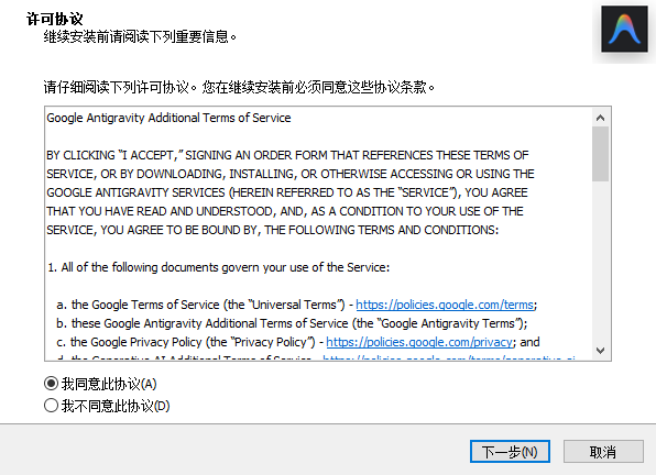 首先下载AntiGravity,官网地址是:https://antigravity.google/下载链接是:https://edgedl.me.gvt1.com/edgedl/release2/j0qc3/antigravity/stable/1.11.3-6583016683339776/windows-x64/Antigravity.exe