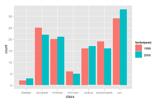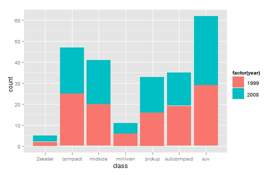 p <- ggplot(data=mpg,aes(x=class,fill=factor(year)))