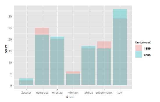 p + geom_bar(position=’identity’,alpha=0.3)