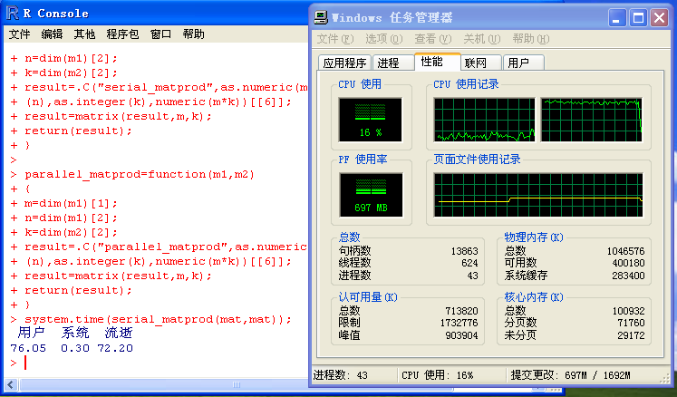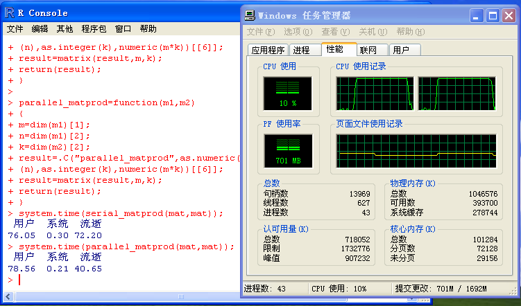 大概你会以为,第二个措施会比第一个措施巨大许多,但实际上,在它们的C措施源代码中,两段措施只有一行是差异的!措施的C源代码、编译出的dll文件以及R源代码可以在这里下载获得,其主要道理就是利用了OpenMP这个支持并行计较的库。一个简朴但很有开导性的先容可以看这里。
